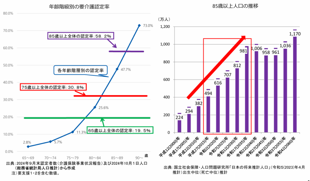 グラフより、要介護認定率は85歳を越えると急速に高まることが読み取れます。そして、加速する高齢化により、日本では85歳以上の人口が今後増加することが予測されています。