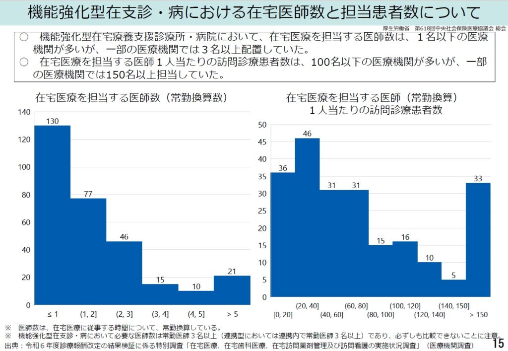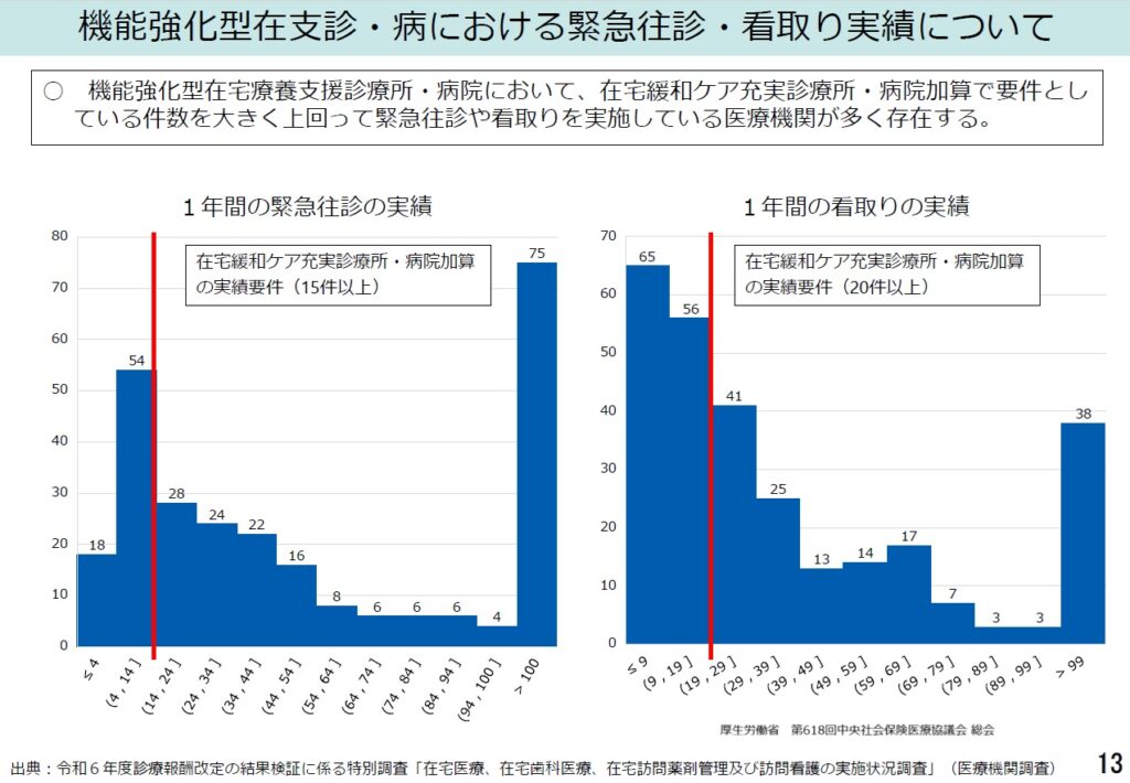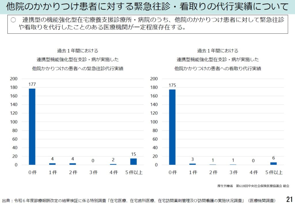 こうした実態から、厚生労働省からは連携で貢献する医療機関に対しても、地域の24時間往診体制への貢献の度合いに応じてきめ細かな評価をしていくことなどを提案している。