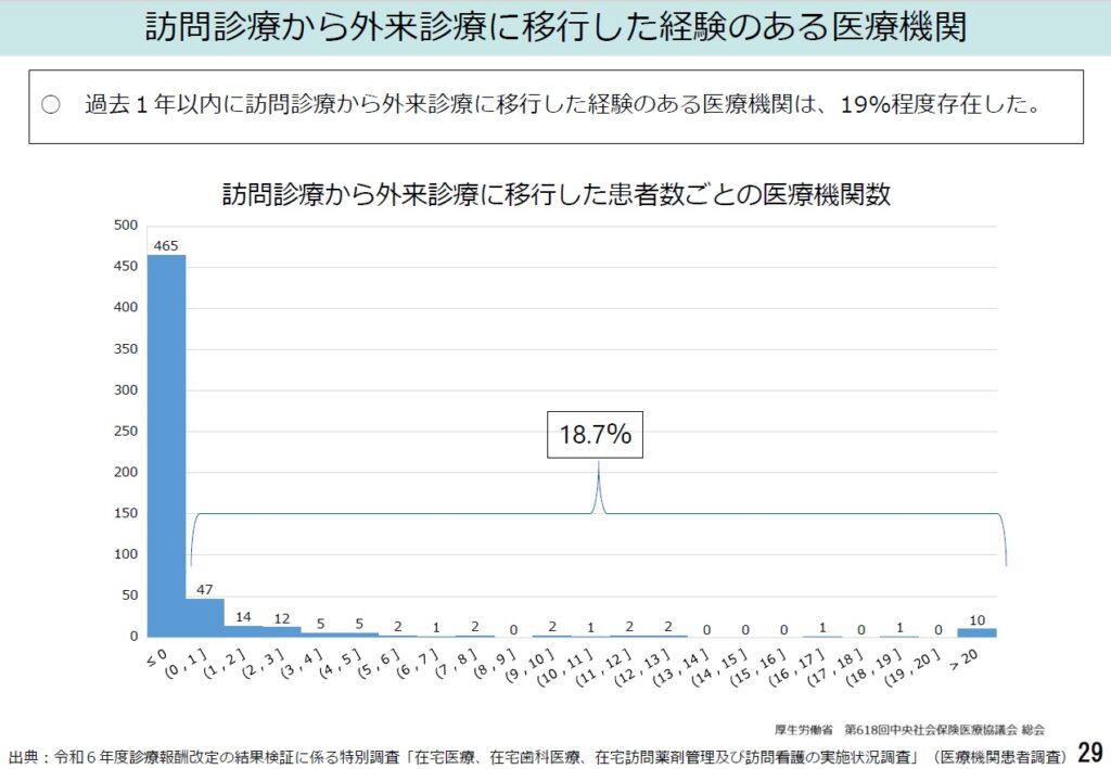 実際に、訪問診療から外来診療に移行したという医療機関が約19%(n=572)確認されている(図5)。要介護度が低い、医療依存度が高くない在宅患者が一定程度いることを示しているといえる。