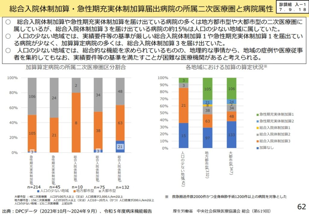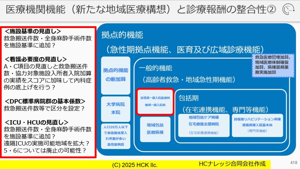 今回の議論では、DPCの標準病院群においても救急搬送受入件数等によって基礎係数で新たに区分を設けることが検討される見通しだ。令和6年度診療報酬改定ではデータ数が90件/月以下の場合の減額される区分が基礎係数に設けられたが、その対応と似たものとなると考えられる。データ数が90件/月以下の場合はDPCからの強制退出となるが、今回の新たな区分を設ける可能性が強制退出にまでつながるかまではわからないが、注意して見ておく必要があるだろう。DPCの要件をより高度急性期に向けて見直し、要件を満たすことが困難な急性期病院の中から地域包括医療病棟を創り出していくというストーリーが描かれているように見える。