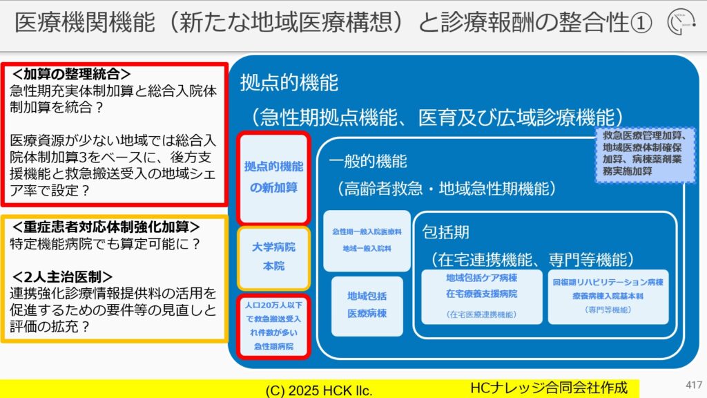 一方、拠点的な急性期機能については、入院・外来医療調査・評価分科会の議論でもあったように、急性期充実体制加算と総合入院体制加算を一本化すること(図3)人口20万人以下の地域や医療資源が限られた地域では総合入院体制加算3をベースにして救急搬送受入件数の地域シェア率やへき地診療所の支援機能を考慮した拠点機能の評価を設けることで議論が進みそうだ。