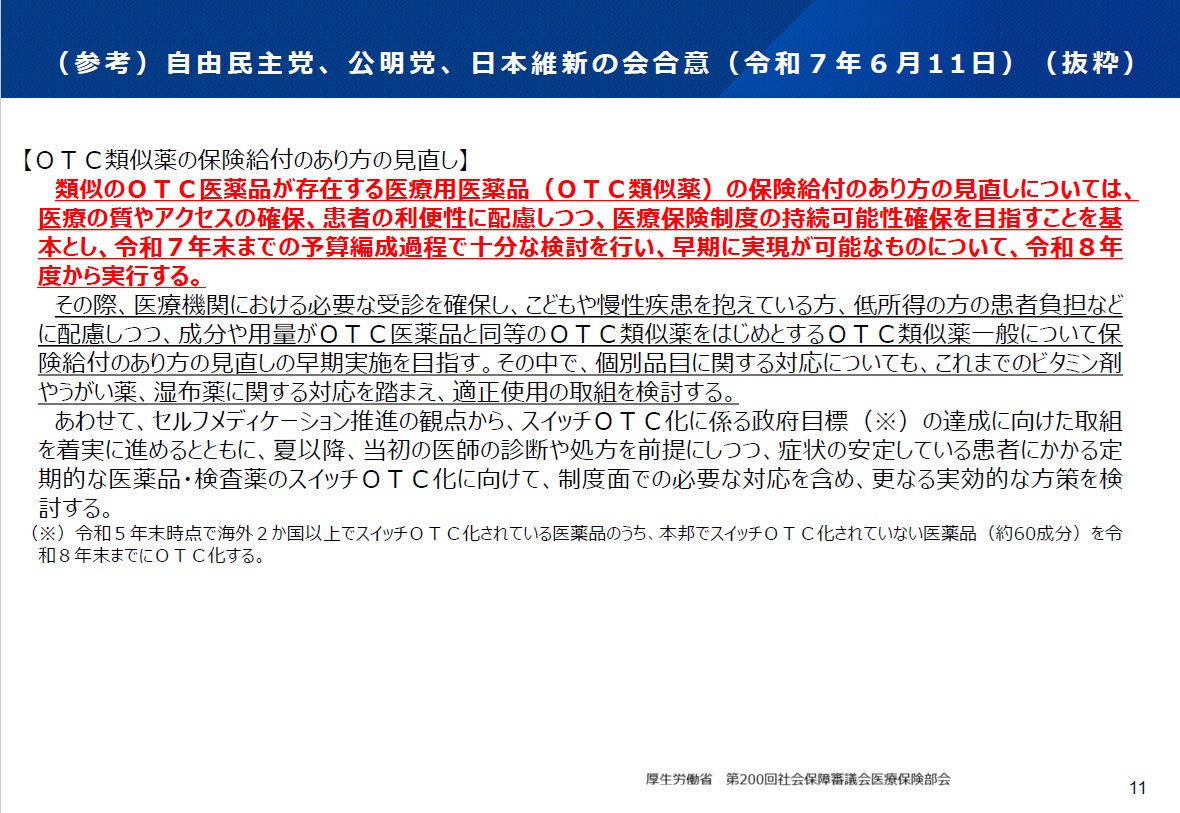令和7年10月16日、第200回社会保障審議会医療保険部会が開催された。この部会は、医療保険制度改革に関する議論を行う場で、伸び続ける医療費を国民が負担できる範囲に抑え込んでいくためのあり方を検討していくもの。今回は薬剤給付のあり方がテーマとなった。薬剤給付については、OTC類似薬の全額自己負担の検討が話題となり、自民党・公明党・日本維新の会による3党合意(図1)がまとめられ、実際に骨太の方針2025にも年内に結論を出すことが明記されたところだ。
