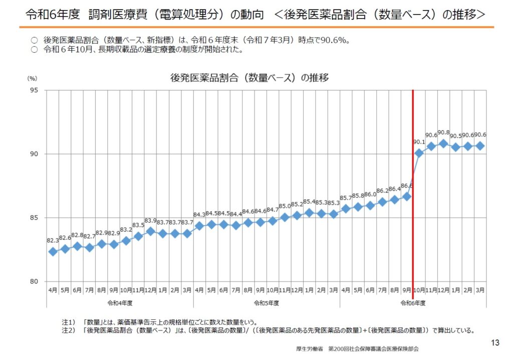 後発医薬品割合は長期収載品の選定療養の影響で大きく伸びるも頭打ちの状況
