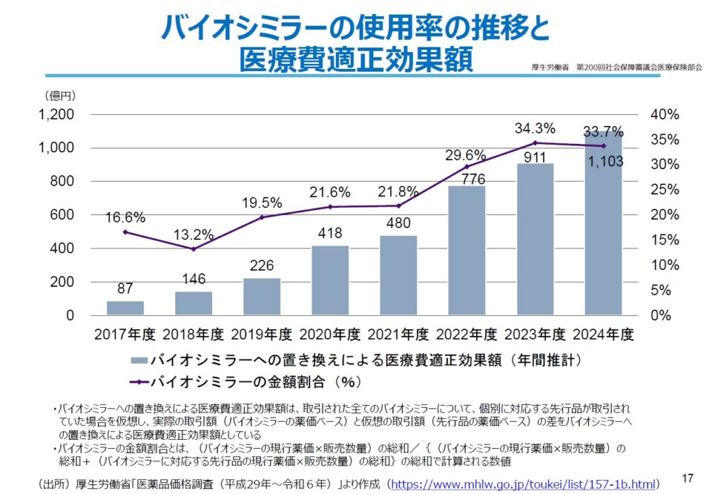 また、新たなロードマップでは後発医薬品の数量割合が全都道府県で80%を超えたら、副次的目標として金額ベースで65%以上を目指す、というものも設定されている。そう考えると、後発医薬品に比べて金額のインパクトが大きいバイオ後続品の使用促進は金額ベースの目標を達成するには重要なポイントになるため、期待も大きい(図3)。