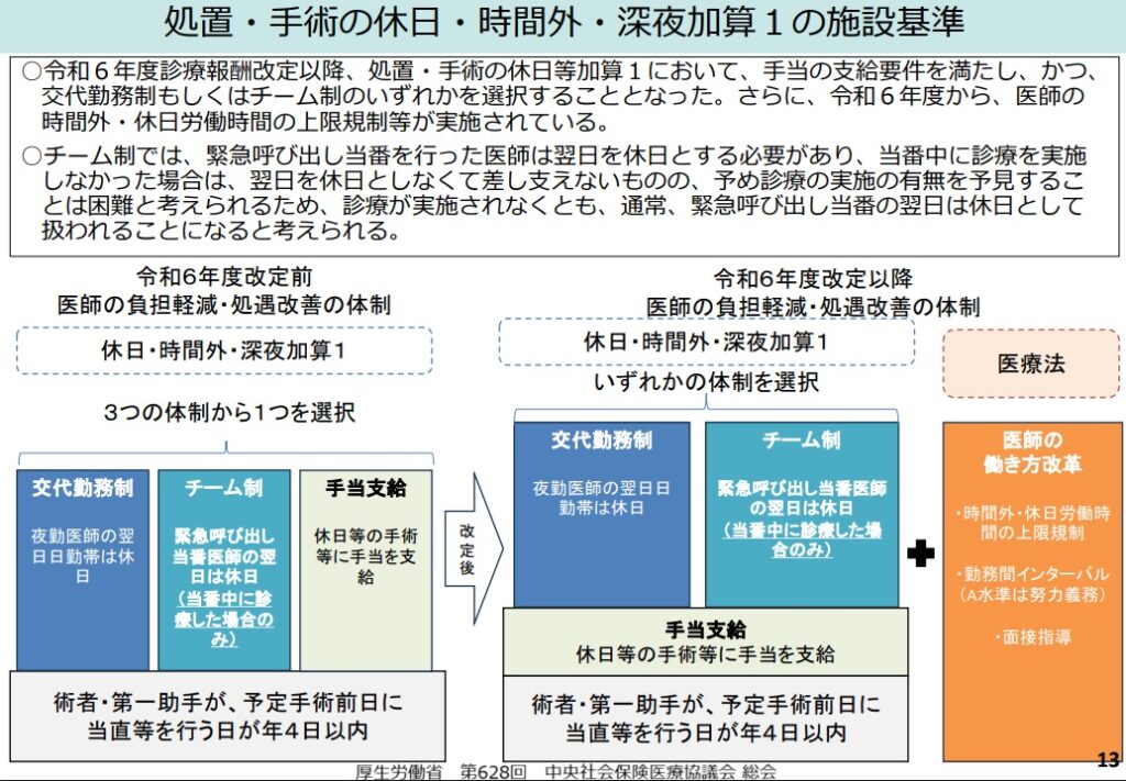 厚生労働省から「処置及び手術の休日・時間外・深夜加算1(図1)について、チーム制では、診療があった緊急呼び出し当番翌日を休日とすることとされているものの、当該緊急呼び出し当番における診療の有無が予見できないことや、令和6年度以降、医師の働き方改革により、原則、勤務間インターバルが確保されていること等を踏まえ、チーム制において緊急呼び出し当番翌日を休日とすることの必要性をどのように考えるか」といった議論が要請されている。