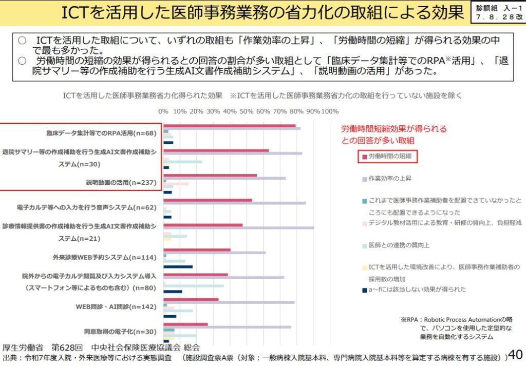 また勤務医の働き方改革の観点からは、医師事務作業補助者による事務作業等の間接業務の支援は非常に効果が高いことが知られている。AIサービスが普及し、医師事務作業補助者の生産性もさらに大きく向上している(図3)。そうした実態から、厚生労働省からは「生成AIを活用した文書作成補助システム等が、作業効率の向上や労働時間の削減効果を示していることを踏まえ、生成AI等のICTを活用して医師事務業務の省力化の取組を進めるにあたり、その評価についてどのように考えるか」といった議論が要請されている。
