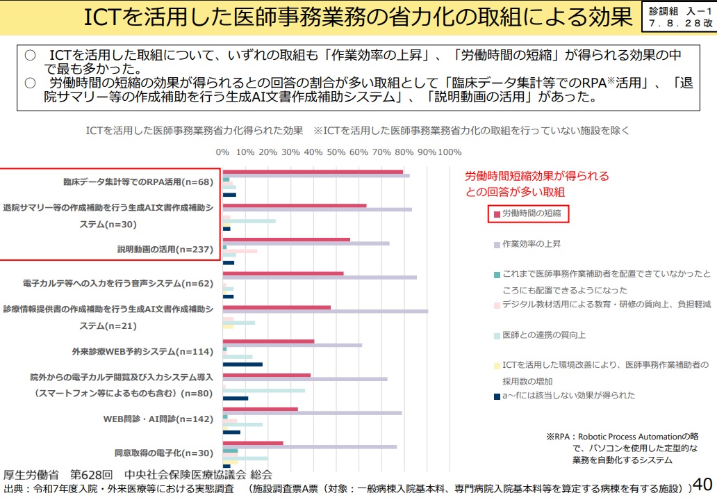 また勤務医の働き方改革の観点からは、医師事務作業補助者による事務作業等の間接業務の支援は非常に効果が高いことが知られている。AIサービスが普及し、医師事務作業補助者の生産性もさらに大きく向上している(図3)。そうした実態から、厚生労働省からは「生成AIを活用した文書作成補助システム等が、作業効率の向上や労働時間の削減効果を示していることを踏まえ、生成AI等のICTを活用して医師事務業務の省力化の取組を進めるにあたり、その評価についてどのように考えるか」といった議論が要請されている。