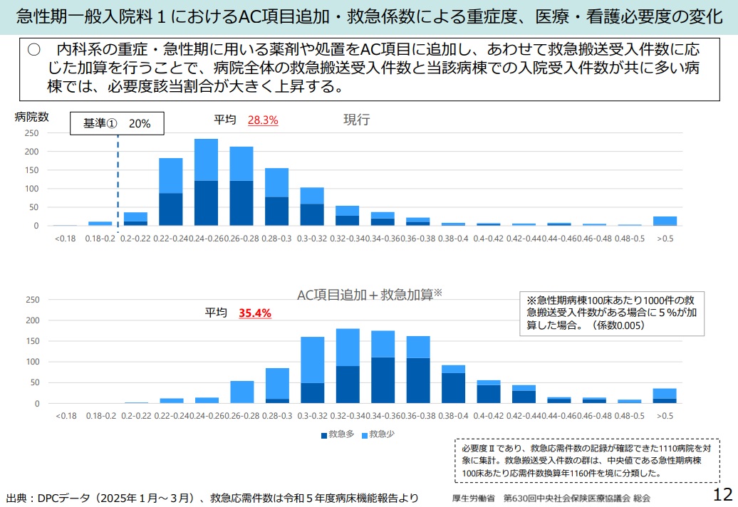 そこで、これまでの入院・外来医療等の調査・評価分科会等で内科系症例を精緻に評価し、救急搬送受入を通じて地域医療に貢献する急性期病院の重症者割合を底上げして経営を安定化させる方向性で議論が進んできた。今回、その実際のシミュレーション結果が公表された。具体的には、A・C項目に新たな項目を追加、救急受入の実績を加味する、というもの(図1)。