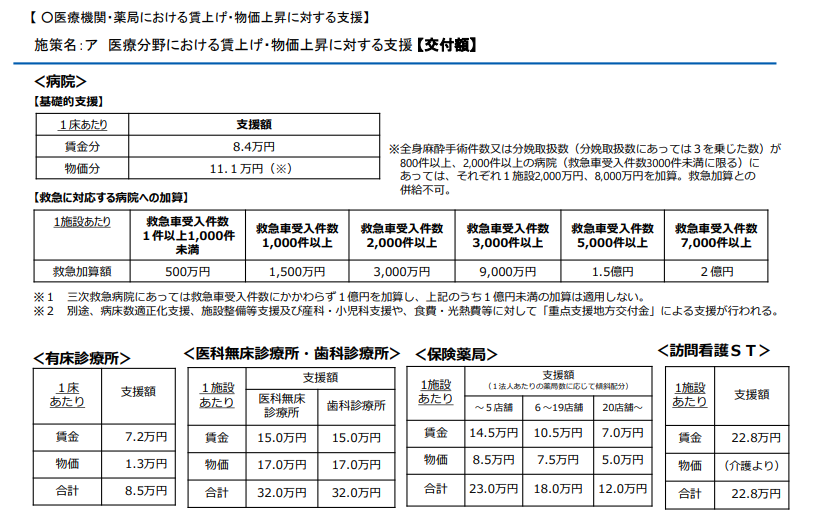 病院に対しては、1病床あたり19.5万円の支援が行われるが、19.5万円のうち処遇改善支援に8.4万円、必要経費の物価上昇対策として11.1万円という内訳になる。無床診療所、薬局に対しては施設単位での支援となるが、薬局については店舗数によって異なる。