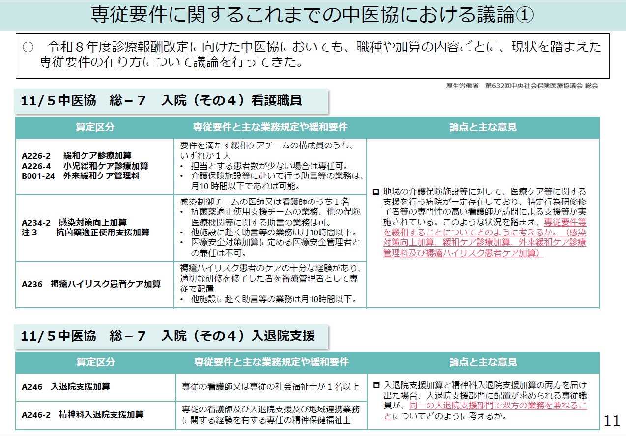 令和7年12月に入り、令和8年度診療報酬改定に関する議論は各論に入り、大詰めを迎えようとしている。第631回と第632回の中央社会保険医療協議会 総会の議論の中から、届出や算定方法の明確化の議論の一つとして専従要件の見直しと救急外来応需体制に関する議論をピックアップして確認する。