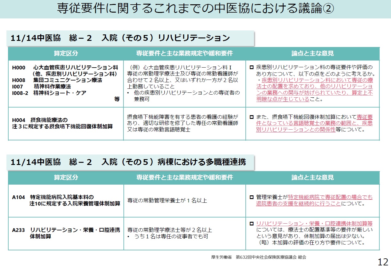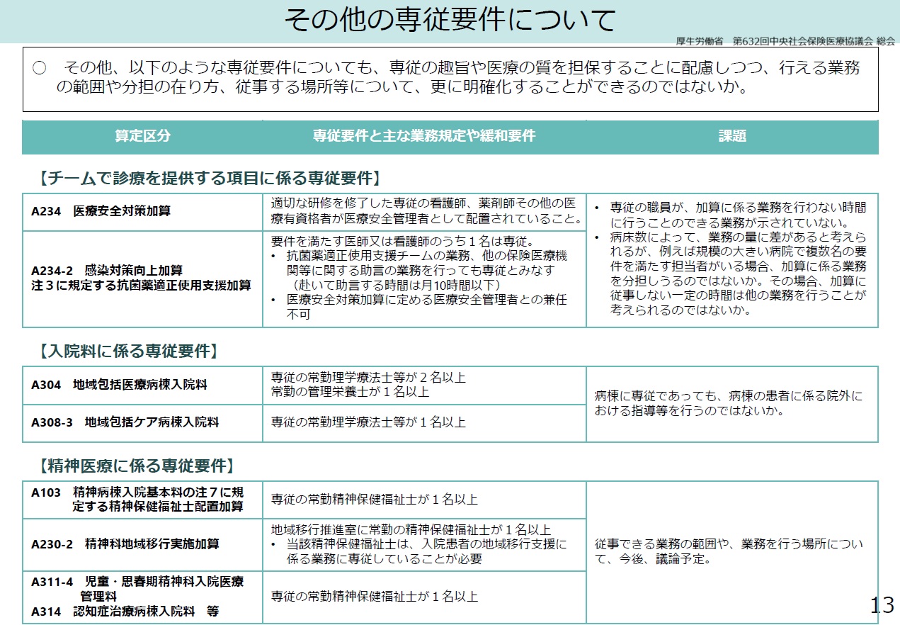 厚生労働省からは、医療安全対策加算や感染対策向上加算の専従者において、加算に係る業務のない時間に実施可能な業務が示されていないことから、他施設への助言業務に関する規定を参考に、月のうち一定の時間までは院内で他の業務に従事可能とすることについての議論と地域包括ケア病棟等における、専従の理学療法士等は、入院患者の退院支援等に係る業務であれば院外での活動に従事できることを明確化することについての議論が要請され、いずれにおいても専従要件の範囲を見直す方向で議論が今後進められていくこととなる。
