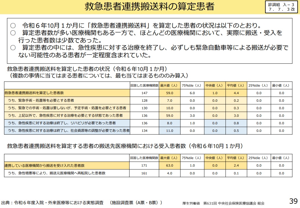 救急自動車に関しては「救急業務のあり⽅に関する検討会(総務省 消防庁)」の報告書に盛り込まれている民間の搬送事業者の活用を「救急患者連携搬送料」においても可能とすることとなりそうだ。また、搬送先が遠距離になる場合の長時間加算が期待される。今後はさらに、下り搬送を受け入れる医療機関についても平時の連携体制の確保などについても議論されていく予定だ。