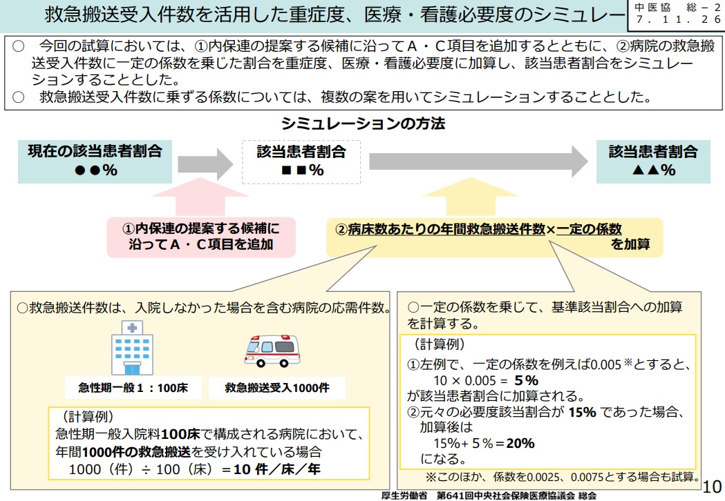こうした結果から、A・C項目の追加及び地域包括医療病棟におけるA得点を2点以上もしくはC得点1点以上とすることと救急搬送受け入れ実績を加味する方向が明確になった。ただ問題は、該当患者割合をどうするかということだ。重症の基準を見直したこともあり、ある程度の割合の引き上げも考えられるだろう。