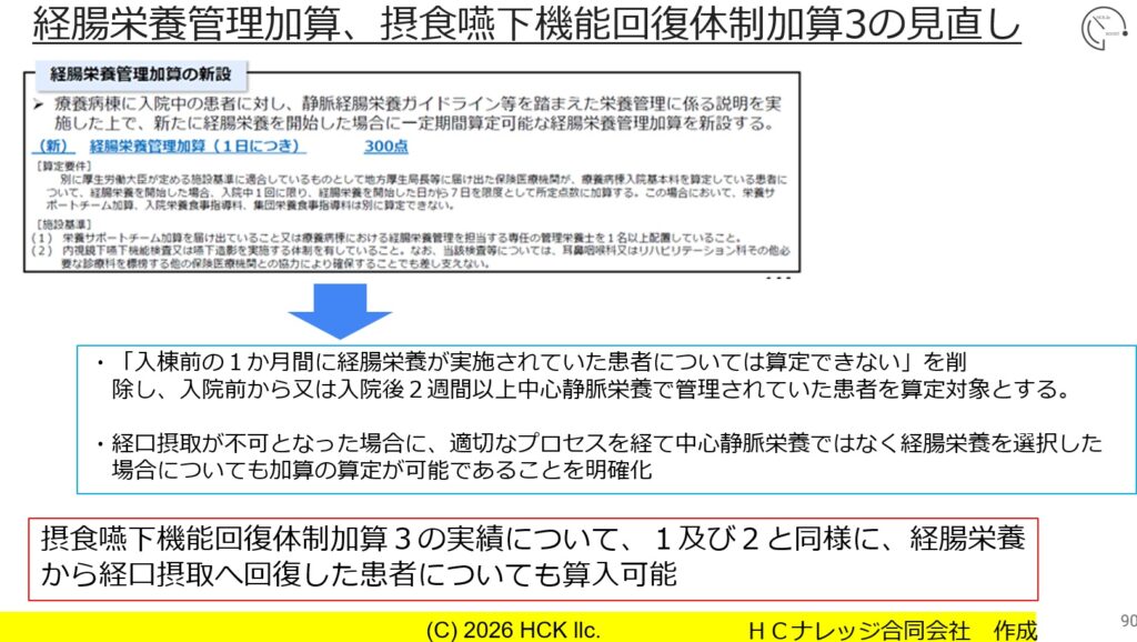 また、療養病棟における経腸栄養管理加算及び摂食嚥下機能回復体制加算3についても見直しが行われることとなり、積極的に経腸栄養・経口摂取への移行に取組む医療機関において評価されやすくなったといえる(図2)。