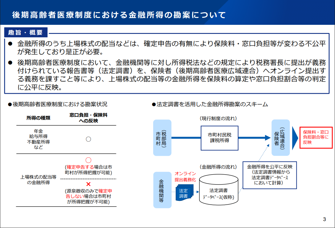 後期高齢者医療制度において、負担の公平性を高めるため、保険料の算定・窓口負担割合等の判定に金融所得(上場株式の配当等)をより適切に反映させるための措置が講じられる。具体的には、法定調書を保険者(後期高齢者医療広域連合)へオンライン提出する義務を課すというもの(図2)。