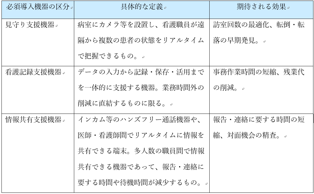 また、人員配置の柔軟化を適用するためには、機器の導入だけでなく、労働環境の改善(超過勤務時間の管理など)や定期的な評価も求められる。対象となるのは急性期一般入院料1~6、急性期病院一般入院料AB 、7対1入院基本料、10対1入院基本料、地域包括医療病棟入院料1・2、小児入院医療管理料1~4、特殊疾患病棟入院料1・2、緩和ケア病棟入院料1・2となる。