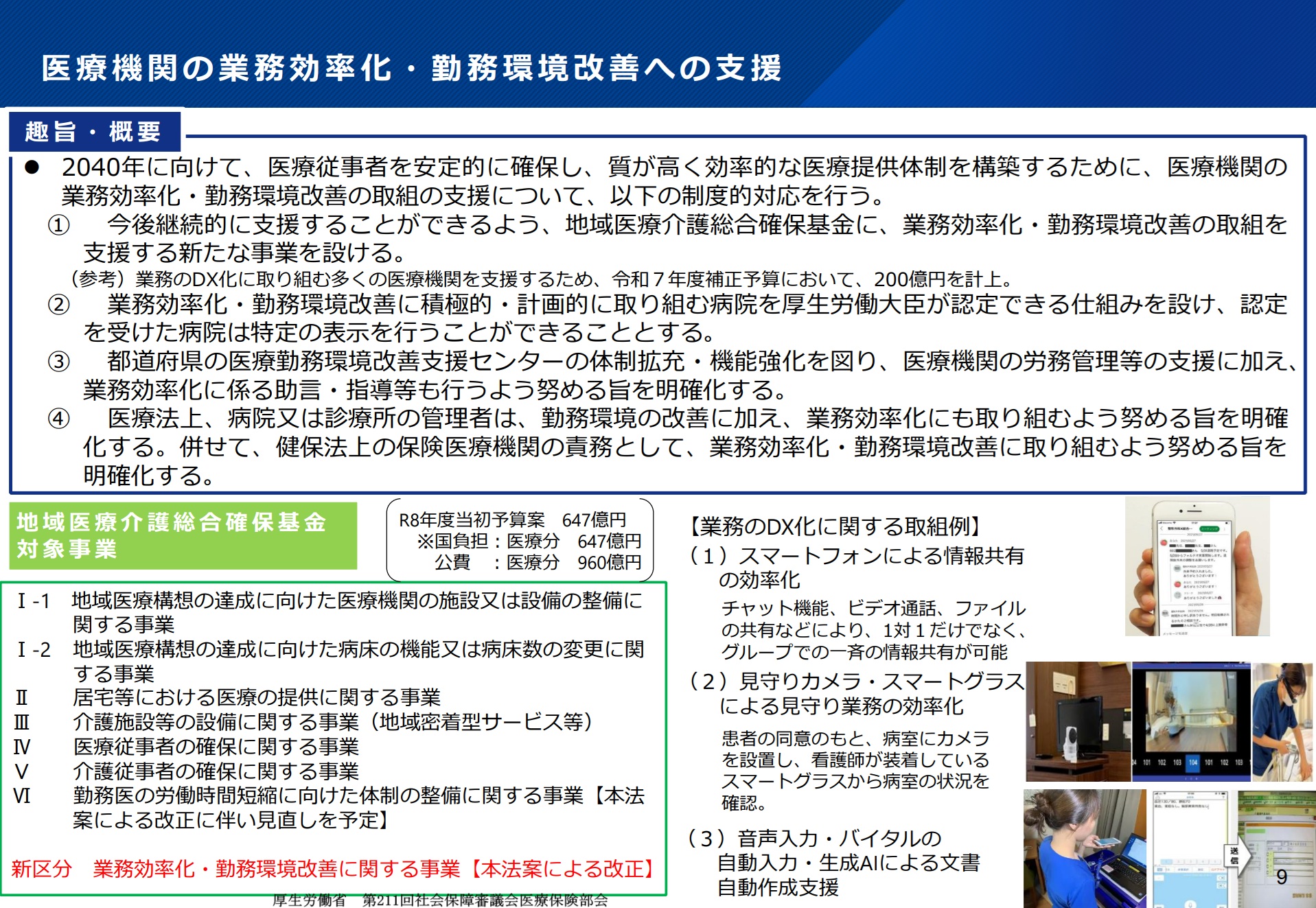 なお、こうした業務効率化の実現にはICT機器の積極的な導入が必要になってくる。そこで、令和7年度補正予算における医療分野の生産性向上に対する支援を利活用することになるだろう。厚生労働省のホームページに「医療分野における業務効率化・職場環境改善支援事業について」のページが設けられており、本年5月から申請受付が始まり、7月以降に選定結果が出ることが示されている。令和8年度中に生じる経費の4/5が補助されるが、1年目の計画終了時、2・3 年目の計画途中及び3年目の計画終了時に報告が必要となり、そこで成果が認められない場合、補助金の返還が求められる場合も有り得る点に注意したい。なお、ベースアップ評価料を届出していることが必須となる。