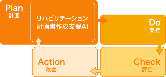 リハビリ計画書作成支援AIを組み合わせることで、リハビリテーション計画の作成を起点としたよりよいPDCAサイクルの運用を実現できます。
